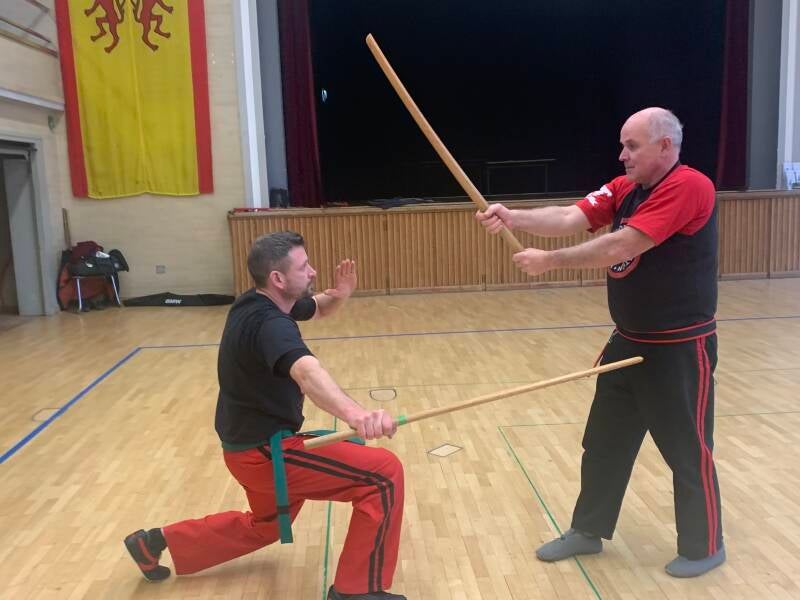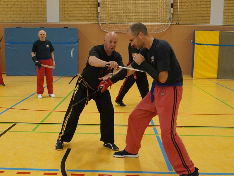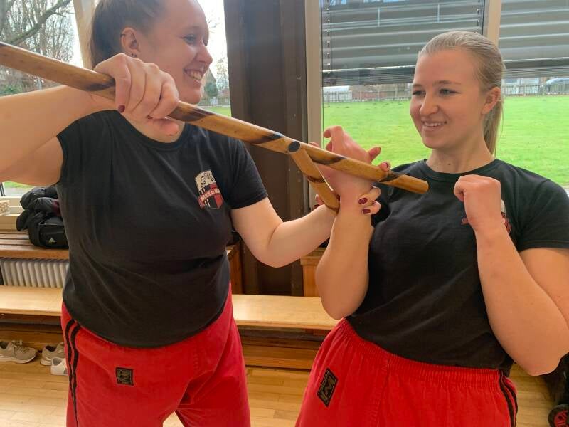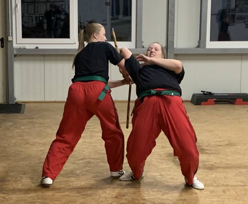 Gezeigt werden mussten verschiedene waffenlose Techniken sowie Übungsdrills und Entwaffnungen von Stockangriffen.