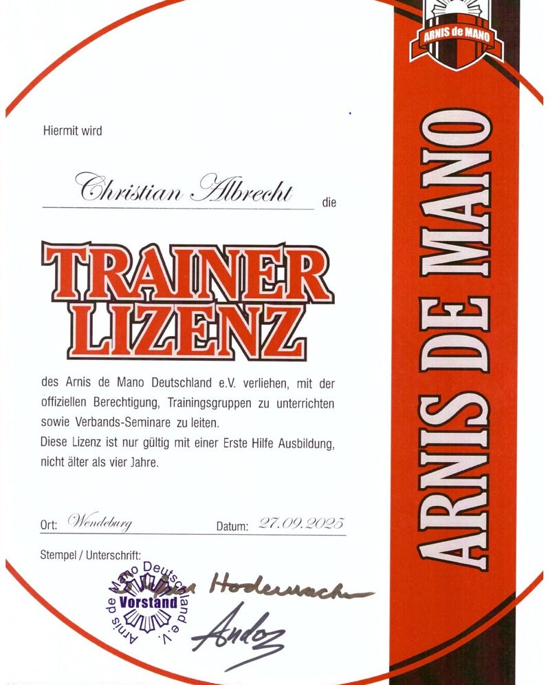 Somit ist Christian jetzt auch als offizieller Trainer im Arnis de Mano gelistet.